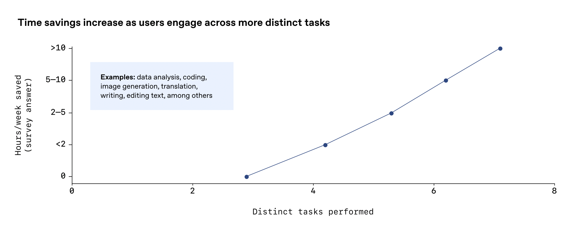 OpenAI’s enterprise warehouse shows the cliff. Workers who weave AI into seven or more task types save five times as much time as workers who stop at four. Not 75 percent more. Five fold. The seventh task is not exotic; it is the one that makes the workflow a single continuous gesture.